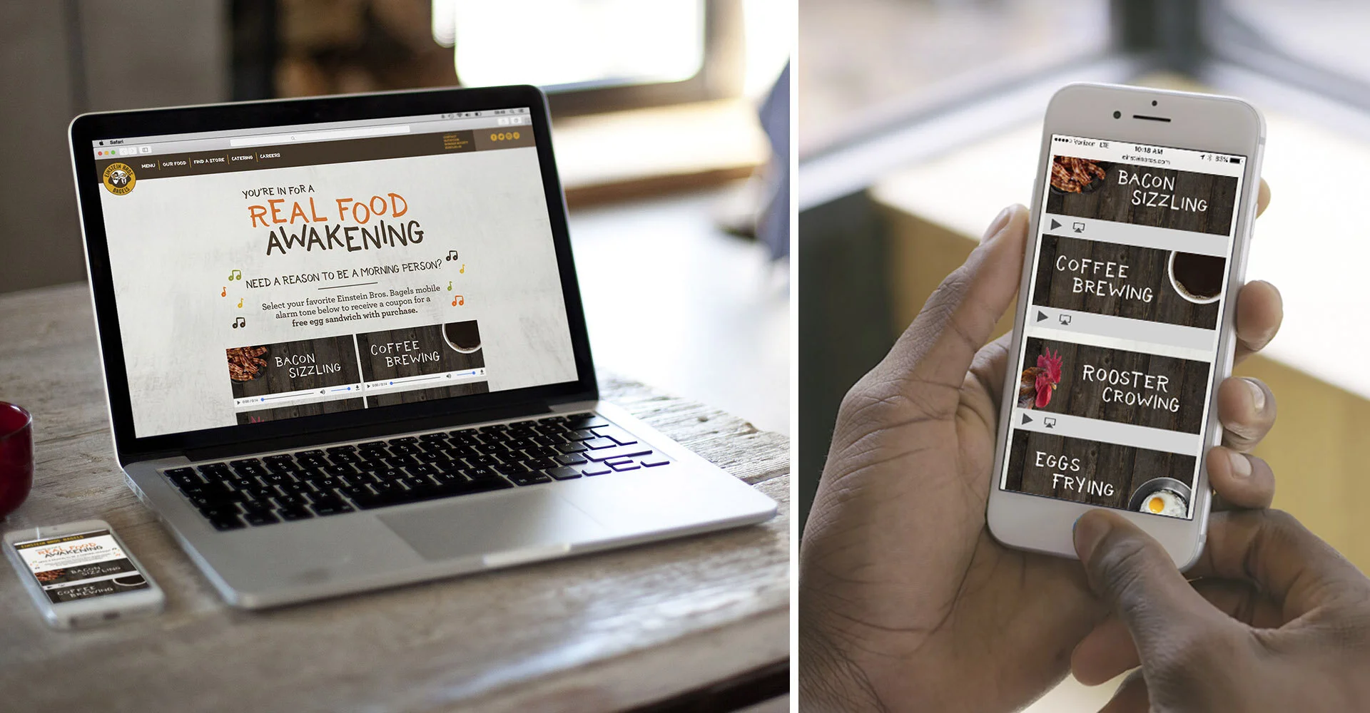 To drive trial of new, limited-time offerings, we changed breakfast from functional to fun. The campaign included point-of-sale posters and a series of downloadable breakfast-inspired Wake-Up Alarm Tones (coffee percolating, bacon sizzling, eggs frying, rooster crowing). Consumers who downloaded got a free coupon.