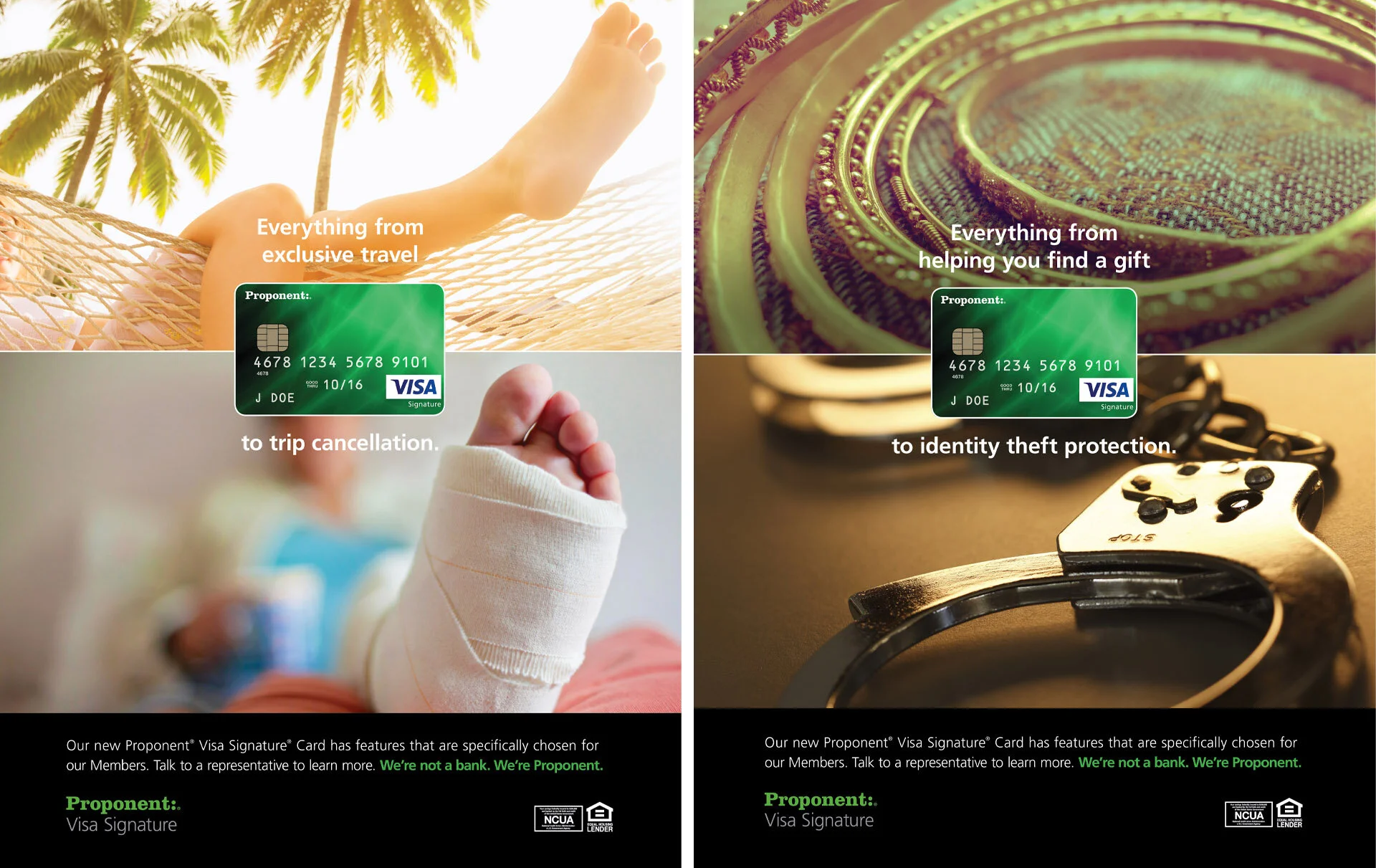 Promoted this credit union’s the portfolio of financial products while establishing a new voice for the overall brand. After an exploration of Proponent’s culture, interviewing management, employees and members (not customers), we discovered that the essence of the brand was found in its name. That’s because they act as an advocate, or a Proponent, for their members in their financial lives. Creative executions included print, out-of-home, direct mail, digital and point-of-sale advertising.